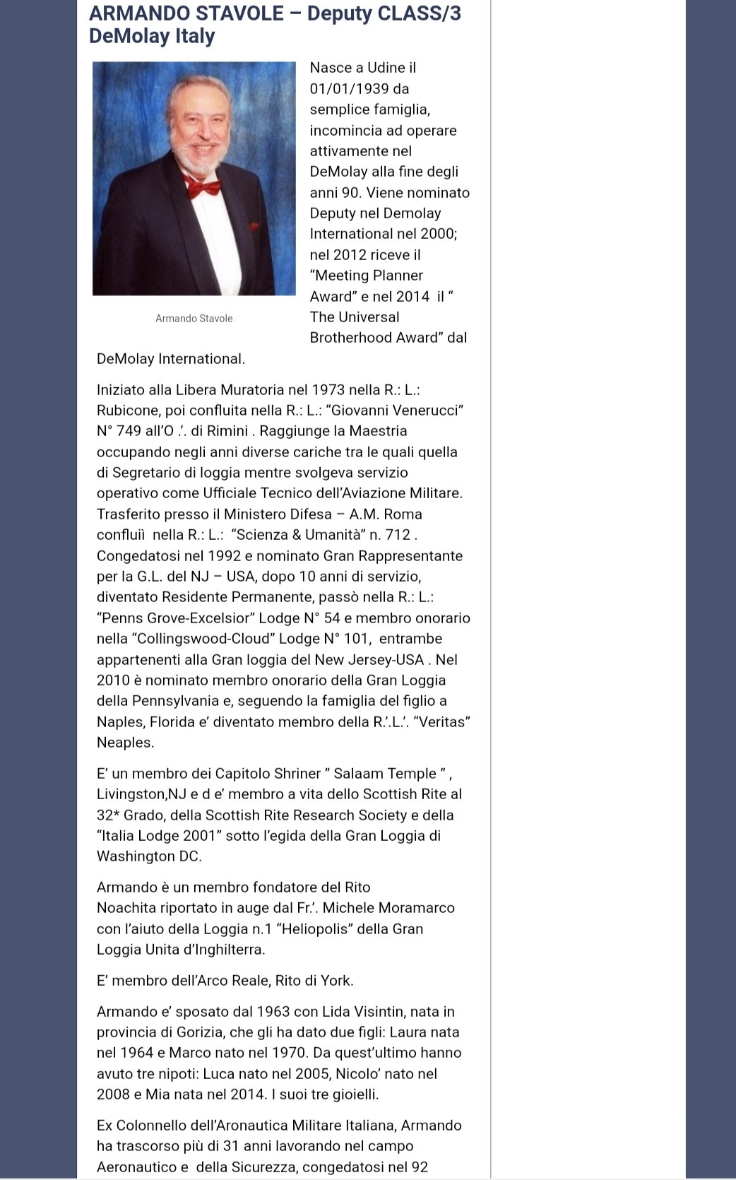Armando Stavole, ex ufficiale Aeronautica. E membro dell’ordine De Molay. Con cui Morello ha scritto a quattro mani il suo secondo tomo, quel “Illuminismo” citato sopra, che in buona sostanza è il manifesto del Movimento americanista.