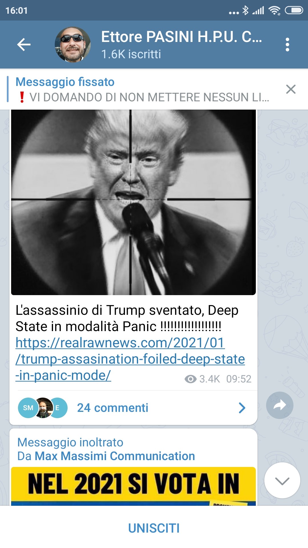 Gestisce inoltre questo canale Telegram da 1648 membri ufficiali dove, fra le molte notizie attendibili che inoltra, non mancano mai le news della Max Massimi Communication.