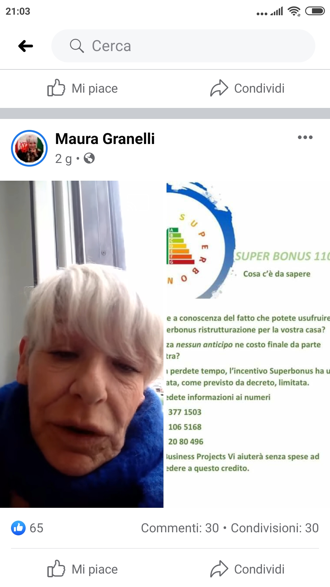 Giorni fa la sig.ra Maura Granelli, ormai nota come Nonna Maura, in una diretta dal suo profilo ha parlato del Super (o Eco) Bonus: consigliando una società, la Business Projects.