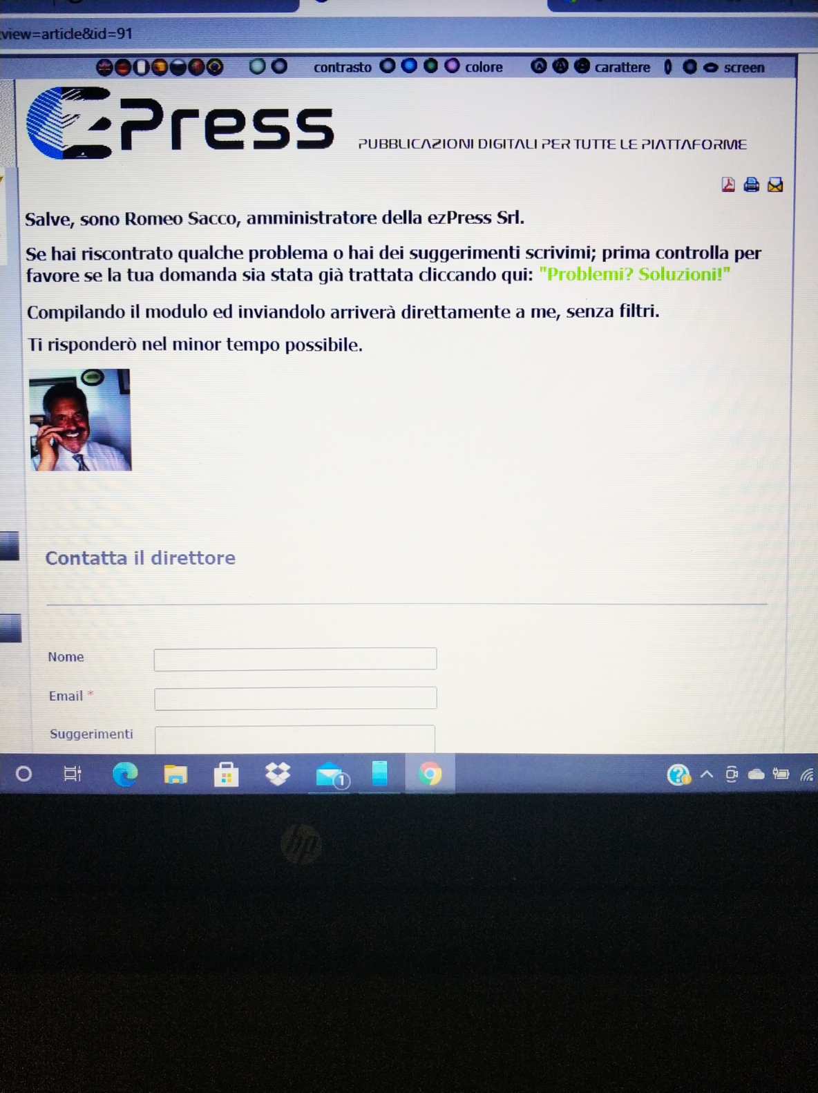 La EzPress, in buona sostanza un’edicola: da cui puoi scaricare, in formato digitale, ciò che trovi in cartaceo al chiosco, pagandolo un po’ meno. E che lui dice essere ormai alla pari dei grandi del settore. Per carità, mi fido, però non l’avevo mai sentita nominare: e la grafica del sito mi pare un po’ troppo basic. Ne è amministratore unico e puoi direttamente scrivergli per esporgli i tuoi problemi.