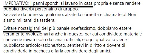 Quindi ricapitoliamo… vi autodefinite “fascisti” (che, vi ricordo, in Italia è REATO) ma poi dite che non sono ammesse nostalgie predappiane: non sono ammesse perchè non tollerate dal movimento o perchè è più conveniente restare “sottotraccia”, ancora vi beccano (ed in tal caso rivedete i testi ragazzi miei, perchè ogni tanto qualche parola vi scappa e vi tradite)? E poi, in questo video, non mi pare ci sia stata coerenza: vi chiamate “camerati”, fra voi. Più e più volte. È il video di questo evento tanto strombazzato