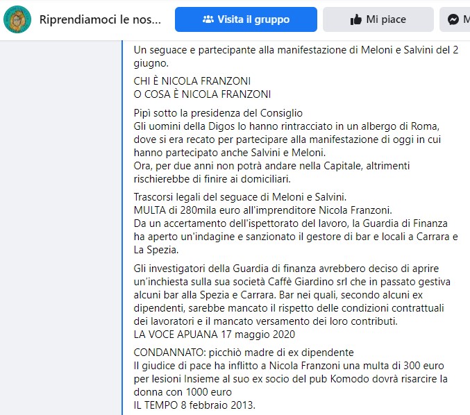 Qualche sera fa ho fatto, sulla mia pagina FB, una diretta insieme all’ex capo di Onda Popolare Lombardia: diretta in cui si mettevano a nudo le, definiamole così, “pecche” del sig. Nicola Franzoni. Il quale si è risentito ed ora minaccia, anzi promette, la querela: non solo a me, ma anche ai miei due ospiti e tutti coloro che sono intervenuti a commentare.
