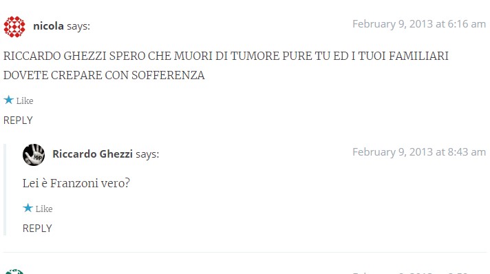 Il blog non lo conosce nessuno, e non lo conoscevo neanch’io. Ma lei, sig. Franzoni, lo conosce vero? Perchè pare che intervenne, in quel blog, all’indirizzo di chi la criticava per queste parole indegne e rivoltanti. Ed intervenne così…