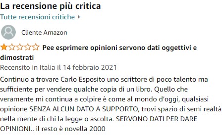 E la loro vita su Amazon si è ridotta a questo: come se non avessero mai letto null’altro in vita loro, non avessero neanche mai comprato un cucchiaio di legno di cedro, su Amazon. Sono entrati, hanno comprato i libri di Esposito, li hanno recensiti e da lì, folgorati, si sono ritirati sul monte Ararat a rileggerli in eterno attendendo la morte.