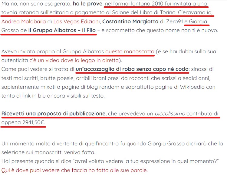 Ci ha costruito un impero, il gruppo Albatros, su questa pratica perfettamente legale: tanto che già al Salone del Libro del 2010, durante una delle conferenze a corollario, è stato persino messo parecchio in imbarazzo da un “esperimento” portato avanti da Linda Rando, fondatrice di Writer’s Dream, che su Ultima pagina racconta quel che avvenne: