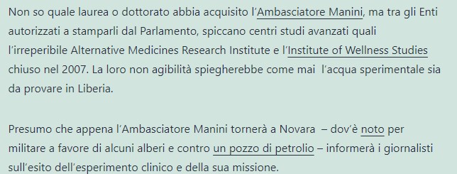 E nonostante già nel 2002 un tale Dr. Alessandro Manini, “Ambasciatore at Large” in Sierra Leone per il Parlamento Mondiale si fosse generosamente premurato di far arrivare in Liberia un farmaco omeopatico per debellare il virus che all’epoca stava decimando la popolazione: l’Ebola.