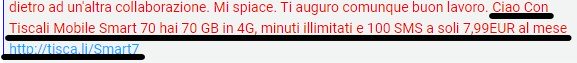 Poi, messo alle strette, salta fuori che no, è una tua iniziativa personale, l’ufficio non c’entra nulla: ma se voglio ci possiamo sentire per telefono. Presumibilmente la Tiscali Mobile da cui mi mandi le mail…
