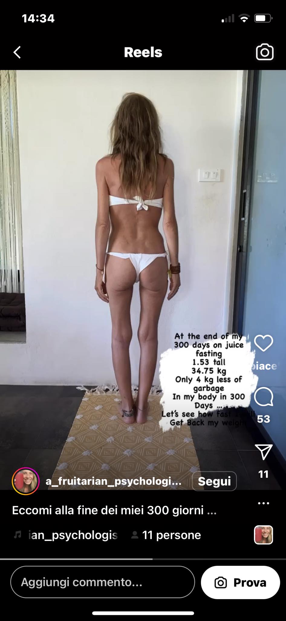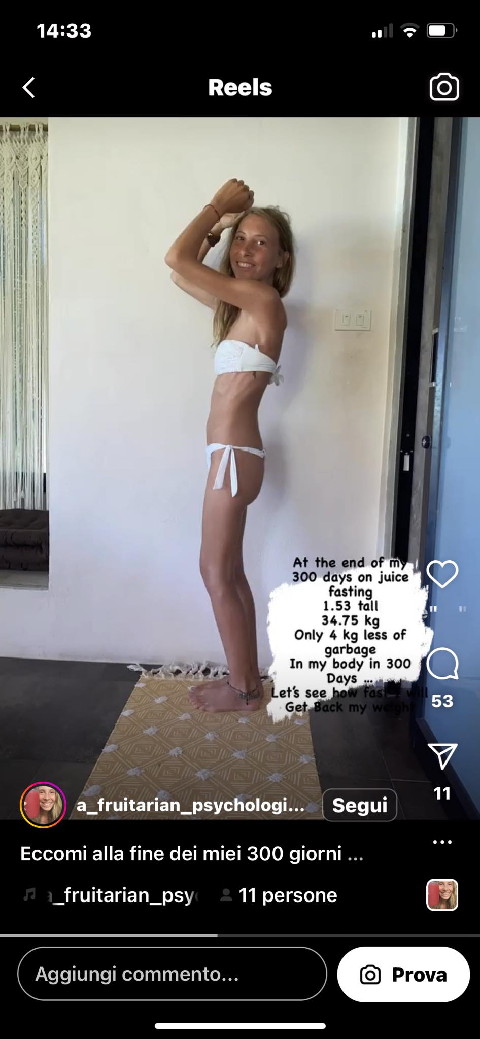 Dall’alto della sua totale assenza di preparazione medica e dei suoi 35 chili scarsi con amenorrea conclamata. Si parte con la frutta e le verdure in forma solida, e si sale: fino a passare dai soli succhi di frutta a rinunciare persino anche all’acqua (ci sono numerosi video in cui racconta anche di questa fase estrema, riservata solo agli eletti).