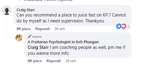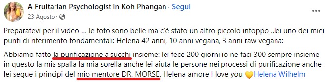 Qui lo dice chiaramente: a chi le chiede se può fornire consigli sul digiuno a base di sola frutta risponde che sì, lei guida le persone lungo questo percorso alimentare (ricordo che non è un medico, e nemmeno un biologo).