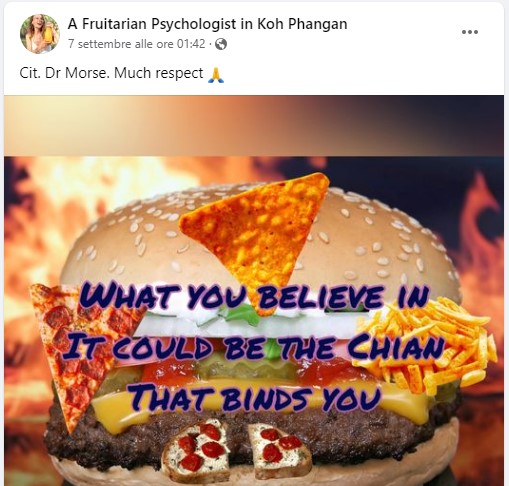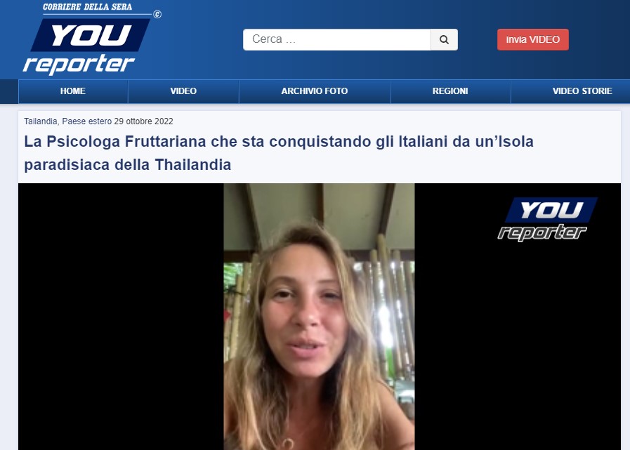 Annabella Alice Pozzoli, meglio nota come A Fruitarian Psychologist in Koh Phangan, è una psicologa trasferitasi da un po’ di anni in Thailandia la quale, da qualche tempo, sta riscuotendo un discreto successo sul web con le sue strambe teorie sull’alimentazione: è citata ad esempio sulla sezione Youreporter del Corriere della Sera: “Molto umilmente e con un sorriso spontaneo, Annabella ci racconta le sue esperienze di lotta contro le avversità che a volte un’alimentazione non idonea le creava, disagi fastidiosi in tema di salute“.