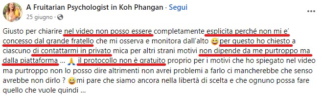 E non lo fa gratis. Altrettanto chiaro, in proposito, è questo post: è in privato, che bisogna chiederle la tariffa. Se no, a suo dire, Facebook la bloccherebbe.