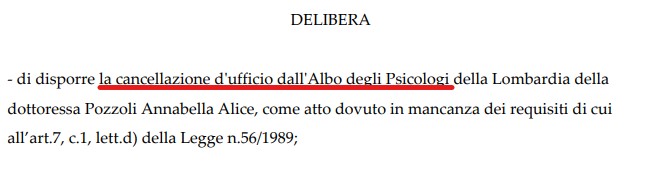 Questa delibera del 15 Maggio 2022 dell’Ordine degli Psicologi, infatti, parla chiaro: ” preso atto che la dottoressa Pozzoli Annabella Alice nata a Milano (MI) il 23/03/1983, iscritta all’Ordine degli Psicologi della Lombardia con il n.14276 dal 09/03/2011, risulta avere la residenza all’estero, senza aver dimostrato di risiedere all’estero al servizio, in qualità di psicologo, di un ente o impresa nazionale che operi fuori dal territorio dello Stato e senza aver comunicato un domicilio professionale in Italia…”