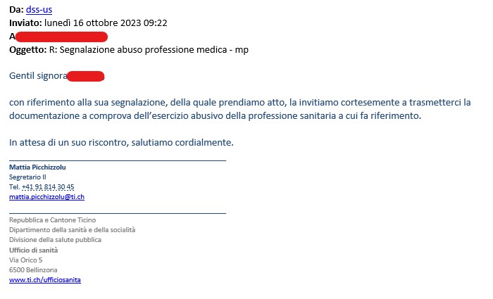 Con Silvia Serena la partita è giunta da pochi giorni ad un punto il quale, spero, sarà foriero di nuovi sviluppi: mi sono infatti messa in contatto con l’associazione dei terapisti complementari del Ticino, e con l’Ufficio della Sanità del Ticino, per segnalare l’esercizio abusivo della professione da parte della signora, e pare che la mia segnalazione sia stata presa in carico.