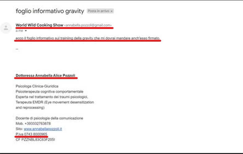 Questo “foglio informativo” ce l’ha mandato via mail la dott.ssa Annabella Alice Pozzoli, con tanto di biglietto da visita completo di numero di Partita Iva.