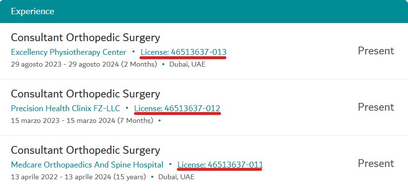 Perché come da noi, in Italia, esiste l’Albo dell’Ordine dei Medici, a cui devi essere iscritto per poter esercitare, negli Emirati Arabi, e quindi a Dubai, esiste la stessa cosa: solo che lì si chiama “Health Authority License“, vale a dire “Licenza dell’Autorità per la Salute”.
