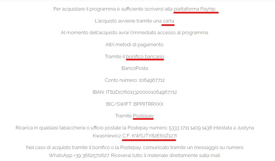E qui la nostra giovane polacca ha pensato bene di diversificare: consulenze, programmi, diete ed Health Coach si pagano direttamente a lei, tramite “Payhip“, una piattaforma di e-commerce nata nel 2011 in UK.