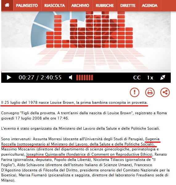 Ed in quanto tale, in quanto femminista, ha goduto anche dell’appoggio del Partito Radicale: qui ad esempio c’è la registrazione, trasmessa da Radio Radicale, di un convegno del 2008, organizzato dal Ministero per la salute e le Politiche Sociali, in occasione dell’anniversario della nascita della prima bimba concepita in provetta.