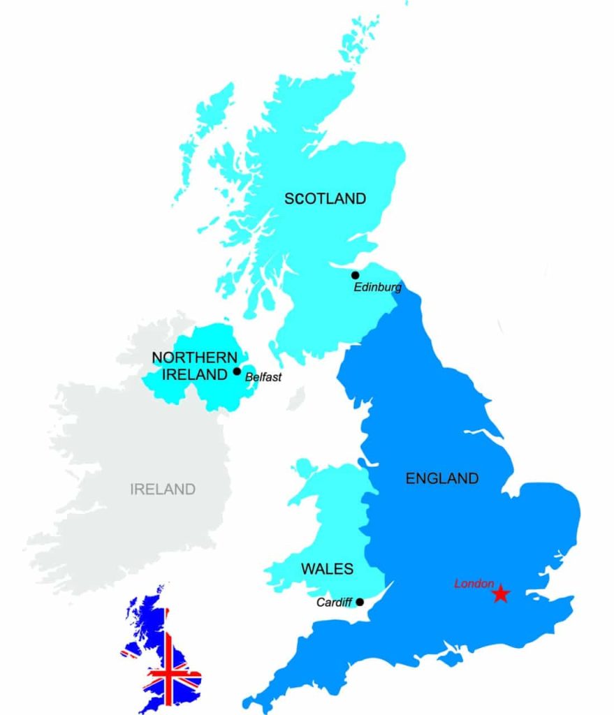Ma il Regno Unito consiste di 4 Stati (se no mica si chiamerebbe Regno Unito, ti pare?): Inghilterra (in cui c’è Londra), Scozia, Galles, ed Irlanda del Nord.