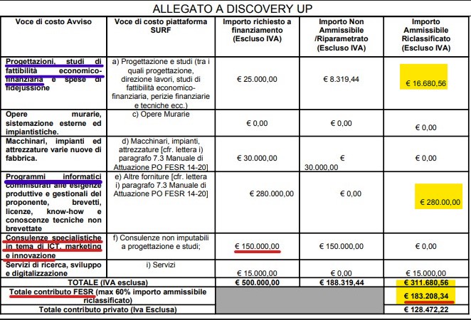 Come si può notare, il grosso dei 183.208 euro ricevuti era costituito dagli iniziali 280mila (mila, manca uno zero nella terza colonna) richiesti per l’acquisto di programmi informatici: perché per macchinari non gliene sono stati dati, e nemmeno i ben 150mila richiesti per le consulenze sono stati concessi.