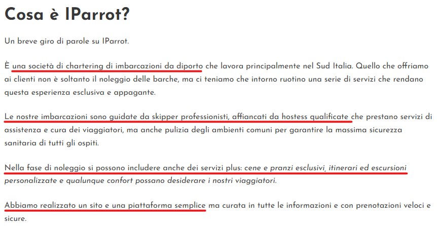 IParrot, secondo la narrazione di Carmine Pappagallo nel suo sito non più esistente, doveva essere addirittura una flotta di imbarcazioni da diporto con tanto di skipper, hostess, cene e pranzi a bordo, e naturalmente sito e piattaforma.