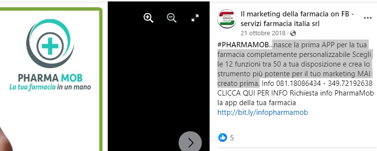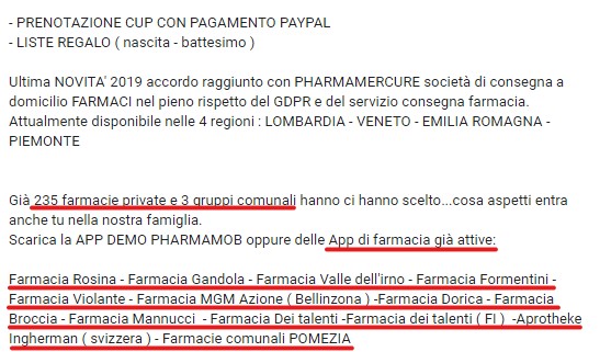 Pharmamob, infine, voleva essere un’app che permetteva ai farmacisti di vendere online: “nasce la prima APP per la tua farmacia completamente personalizzabile. Scegli le 12 funzioni tra 50 a tua disposizione e crea lo strumento più potente per il tuo marketing MAI creato prima“.