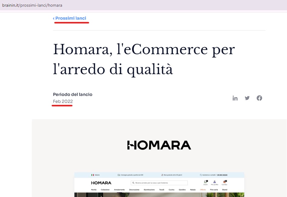 Homara srl doveva essere un e-commerce per l’arredo di design. Nel febbraio del 2022 Brainin srl ne annunciava il prossimo lancio:questo annuncio è l’unica traccia che se ne trova.